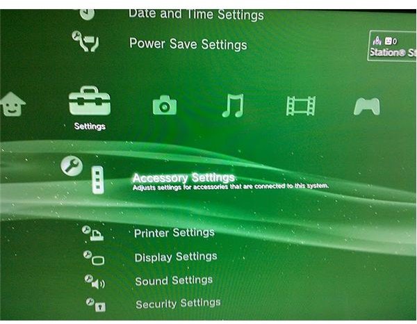 From the "Settings" menu, roll downwardly to the tenth selection, "Accessory Settings." You'll find it between the "Power Salve Settings" and "Printer Settings" options. Press the "X" button on your PS3 Controller to enter the "Accessory Settings" menu.